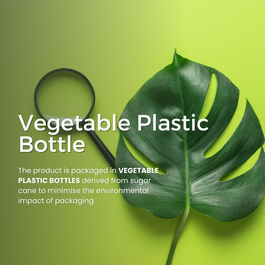The product is packaged in VEGETABLE PLASTIC BOTTLES derived from sugar cane, to minimise the environmental impact due to packaging.