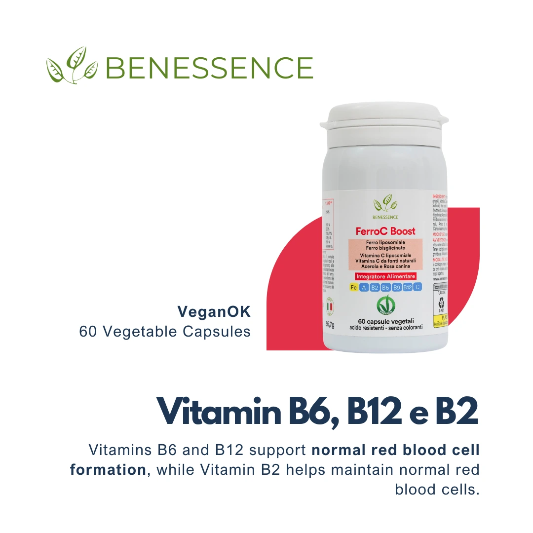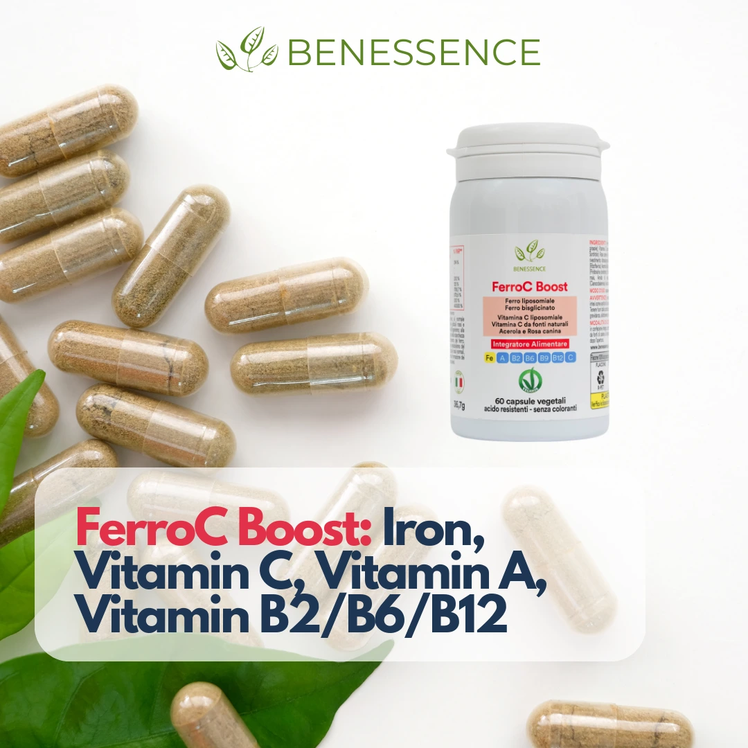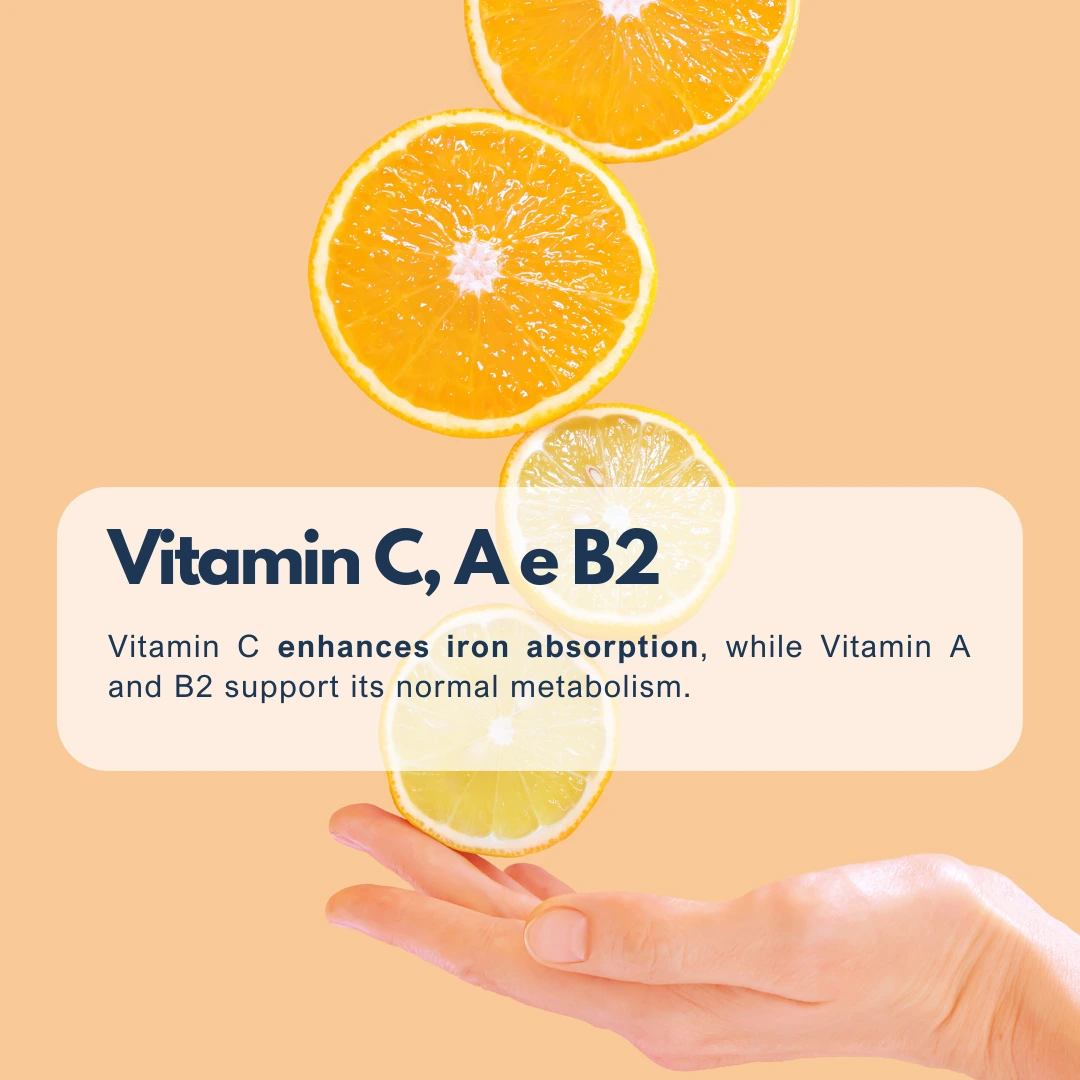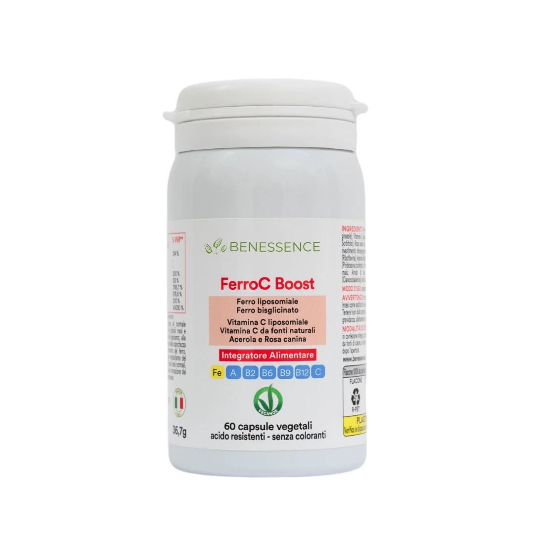 Iron C boost is a vegan Iron bisglycinate and liposomal iron and vitamin C dietary supplement, useful in cases of iron deficiency and perfect for combating tiredness and fatigue and stimulating cognitive functions. Enriched with Vitamin B2, B6, B12 and folic acid, it is indicated in cases of iron deficiency or increased need. It can be used to treat malabsorption or acute and chronic blood loss.