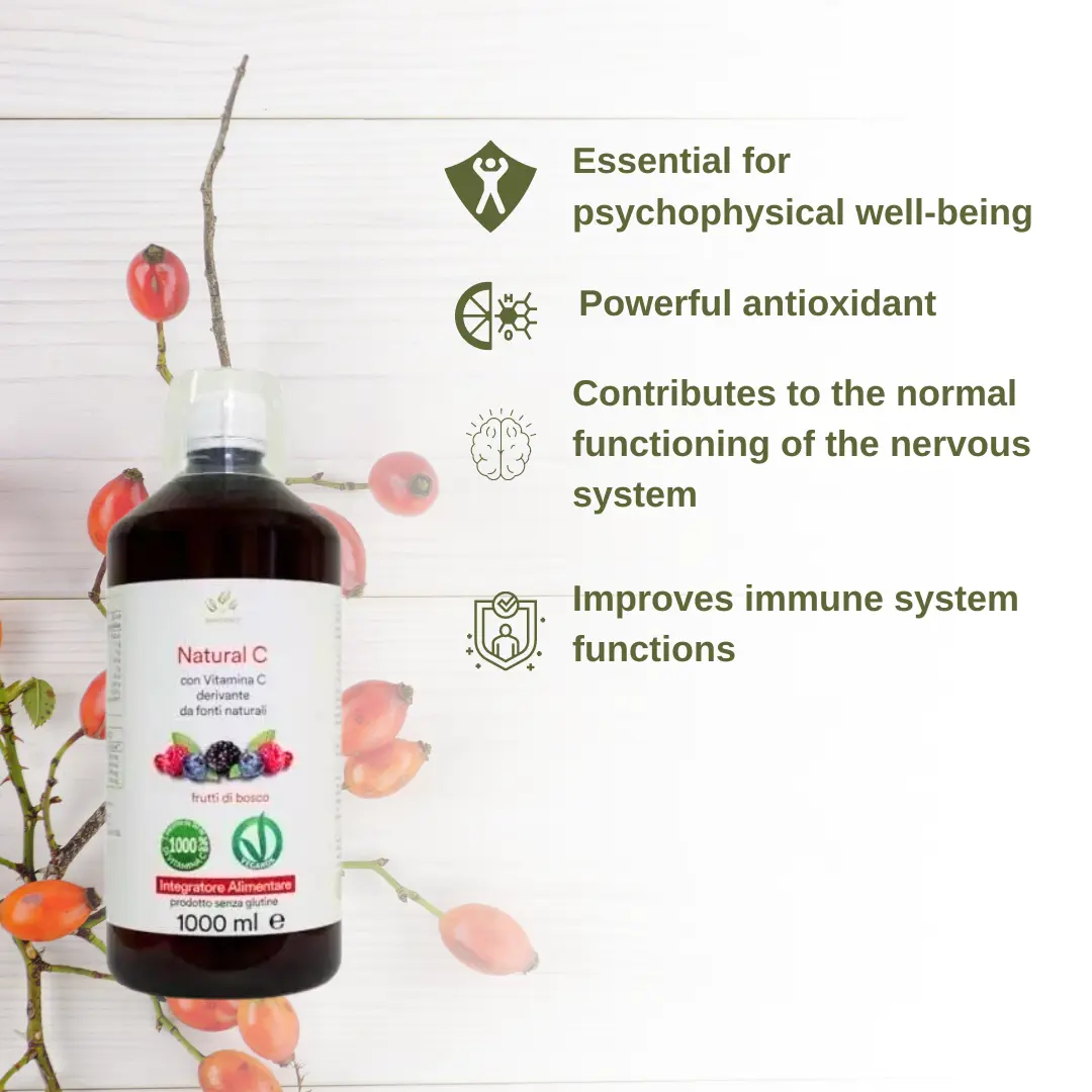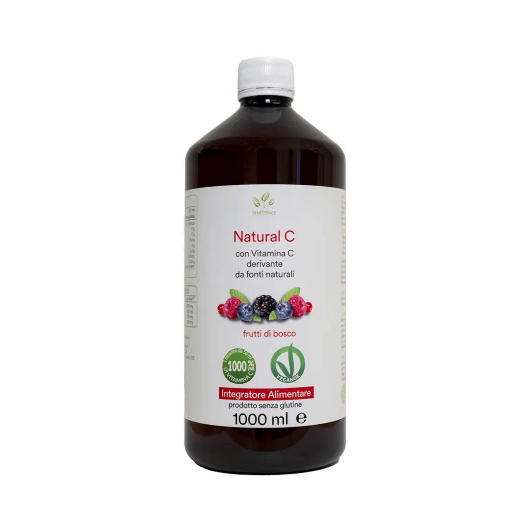 Natural C: Water, Wild berry juice from concentrate 6.4% (in varying proportions: Black cherry, Raspberry, Strawberry, Blueberry, Currant and Blackberry), Acerola (Malpighia glabra L. fructus) dry extract titrated at 50% Vitamin C, Rosehip (Rosa Canina L. fructus) dry extract titrated at 70% Vitamin C, Maltodextrin, Fructose, Natural flavour; Preservatives: Potassium sorbate, Sodium benzoate.