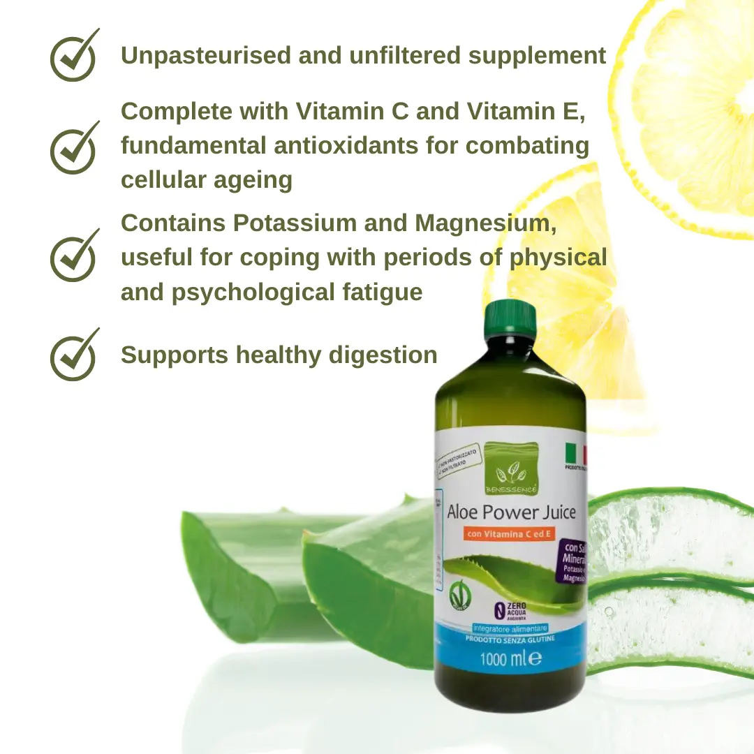 Aloe Power: Juice and pulp of Aloe Vera (Aloe Barbadensis Miller) 96%, Potassium citrate, Magnesium citrate, Sodium chloride, Natural lemon flavour; Preservatives: Potassium sorbate, Sodium benzoate; Acidifier: Citric acid; Antioxidants: Ascorbic acid, Vitamin E acetate.