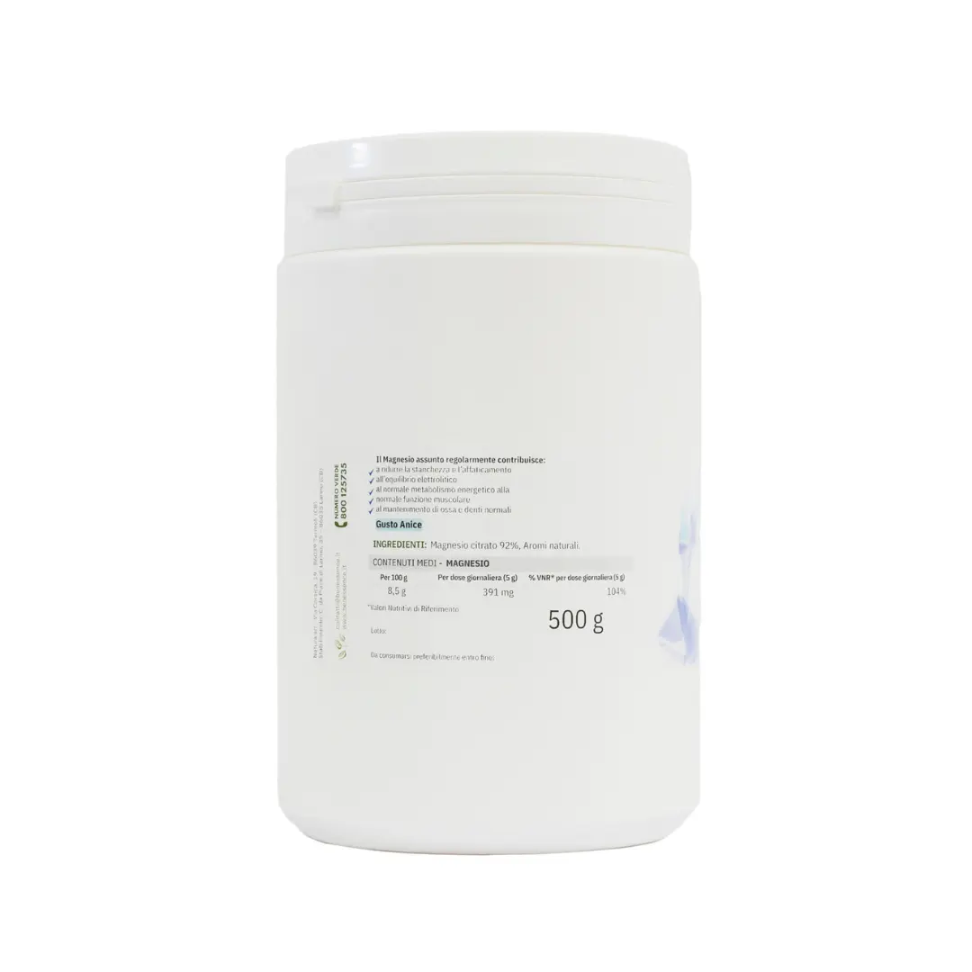 Dietary supplement of soluble Magnesium citrate powder with Aniseed flavour. Stocked for 100 days’ supplementation, it contains pure magnesium citrate. Magnesium is an electrolyte and is among the most abundant elements in our body and is necessary for the performance of fundamental functions in our body.