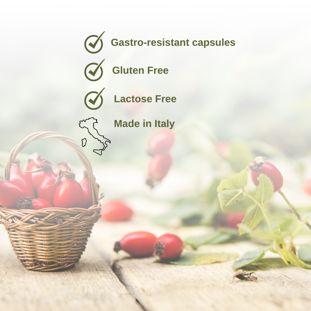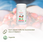 Natural C in gastro-resistant vegetarian capsules contains dry extracts of Acerola and Rosehip, which are rich in bioflavonoids and natural sources of Vitamin C.
