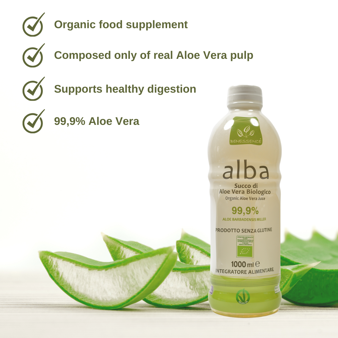 Organic Aloe Vera juice is made from Aloe Barbadensis Miller leaves harvested from plants that are at least 5 years old, without the addition of water. These plants are grown in a completely natural way in warm countries, where the climate is ideal for this plant species. The result is a pasteurised and filtered product, free of aloin.