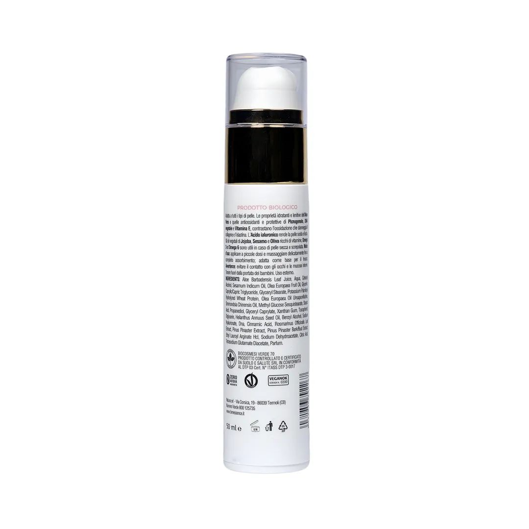 Inci / IngredientsAloe Barbadensis Leaf Juice, Aqua, Cetearyl Alcohol, Sesamum Indicum Oil, Olea Europaea Fruit Oil, Glycerin, Caprylic/Capric Triglyceride, Glyceryl Stearate, Potassium Palmitoyl Hydrolyzed Wheat Protein, Olea Europaea Oil Unsaponifiables, Simmondsia Chinensis Oil, Methyl Glucose Sesquistearate, Stearic Acid, Propanediol, Glyceryl Caprylate, Xanthan Gum, Tocopherol, Diglycerin, Helianthus Annuus Seed Oil, Benzyl Alcohol, Sodium Hyaluronate, Dna, Cinnamic Acid, Rosmarinus Officinalis Leaf Extract, Pinus Pinaster Extract, Pinus Pinaster Bark/Bud Extract, Ethyl Lauroyl Arginate Hcl, Sodium Dehydroacetate, Citric Acid, Tetrasodium Glutamate Diacetate, Parfum*. *profumazione ipoallergenica