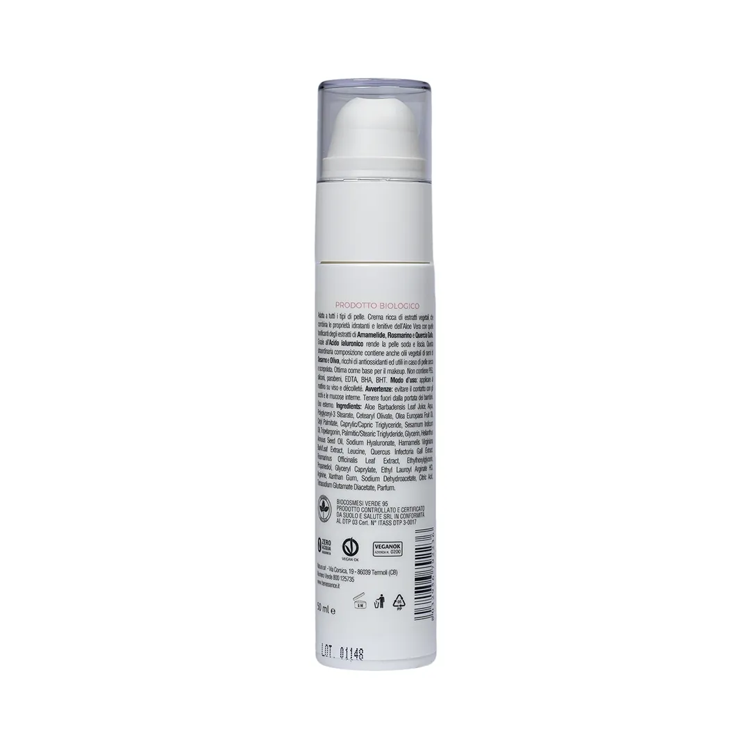 Inci / IngredientsAloe Barbadensis Leaf Juice, Aqua, Polyglyceryl-3 Stearate, Cetearyl Olivate, Olea Europaea Fruit Oil, Cetyl Palmitate, Caprylic/Capric Triglyceride, Sesamum Indicum Oil, Tripelargonin, Palmitic/Stearic Triglyderide, Glycerin, Helianthus Annuus Seed Oil, Sodium Hyaluronate, Hamamelis Virginiana Bark/Leaf Extract, Leucine, Quercus Infectoria Gall Extract, Rosmarinus Officinalis Leaf Extract, Ethylhexylglycerin, Propanediol, Glyceryl Caprylate, Ethyl Lauroyl Arginate HCl, Arginine, Xanthan Gum, Sodium Dehydroacetate, Citric Acid, Tetrasodium Glutamate Diacetate, Parfum*. * Profumazione ipoallergenica