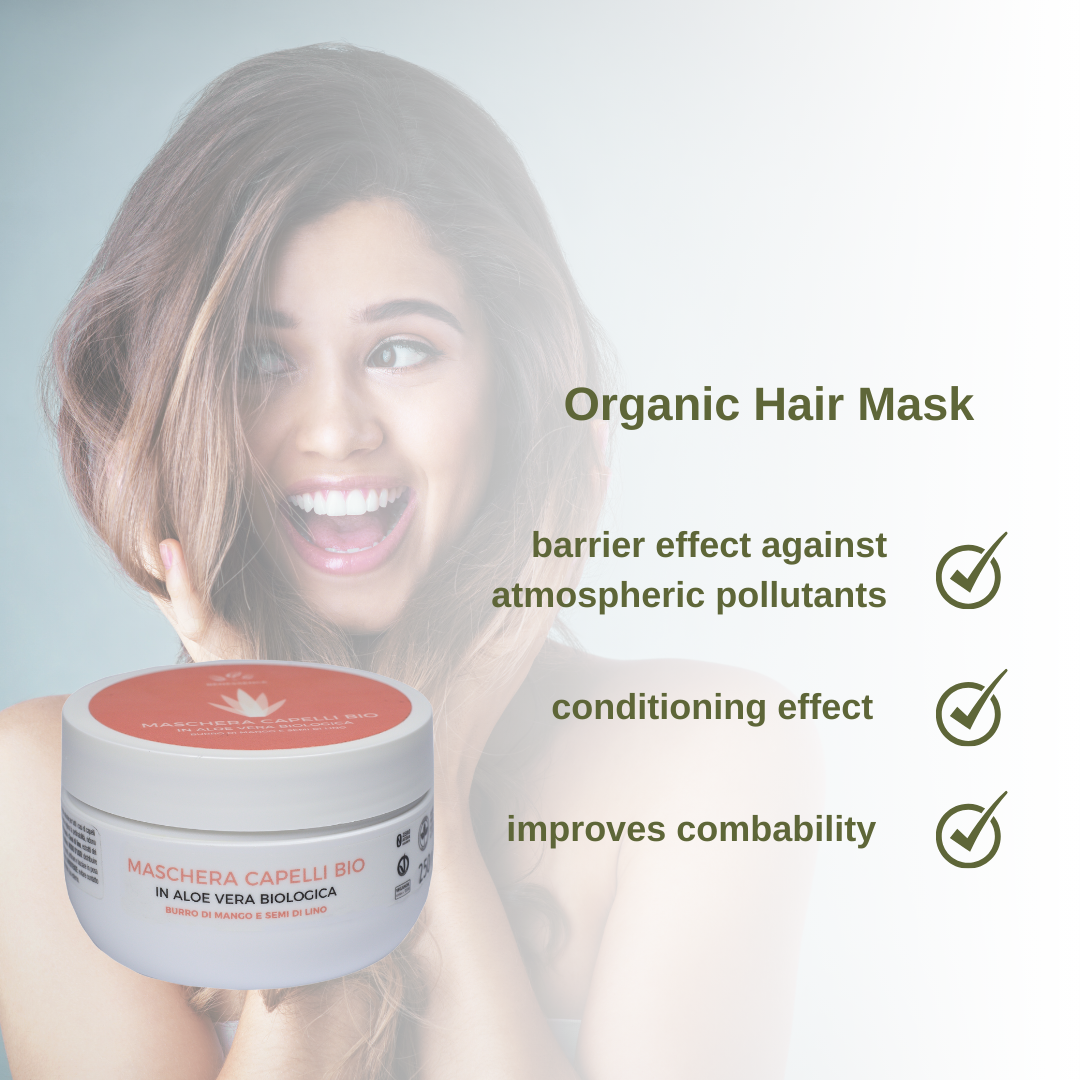 Organic hair mask based on Aloe Vera and African Mango butter, suitable for all hair types.