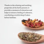 An additional benefit of Relax Herbal Tea is its ability to promote sleep. When consumed before going to sleep, the components in the blend work synergistically to promote relaxation, thus facilitating a peaceful and rejuvenating night’s rest.