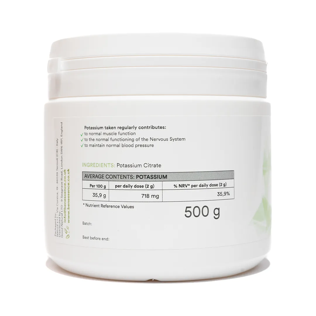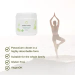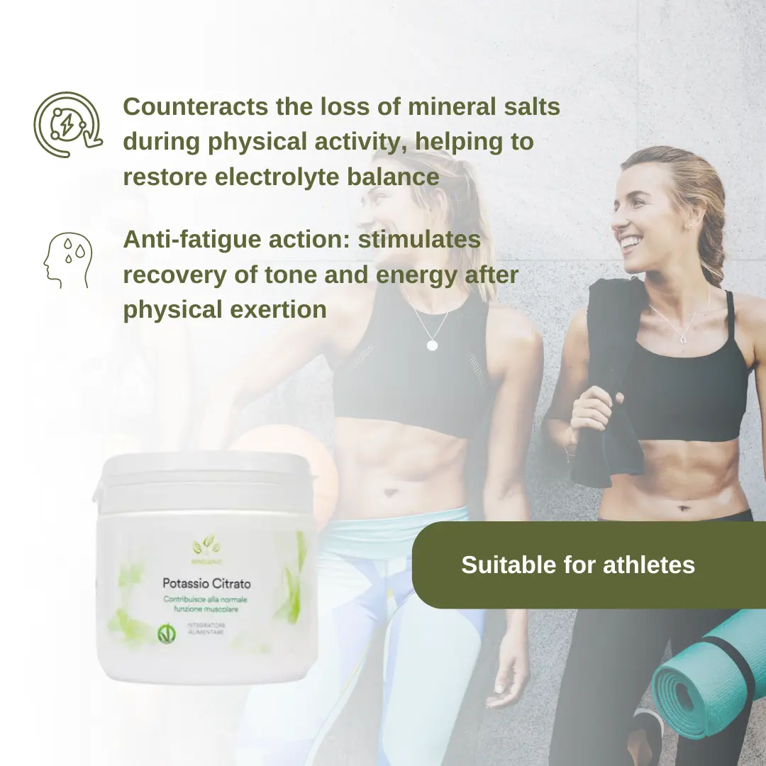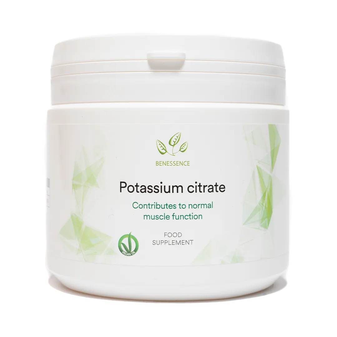 Potassium citrate soluble powder food supplement. It contains only 100% pure potassium citrate. Essential for wellbeing, potassium is a mineral involved in important functions in the body.