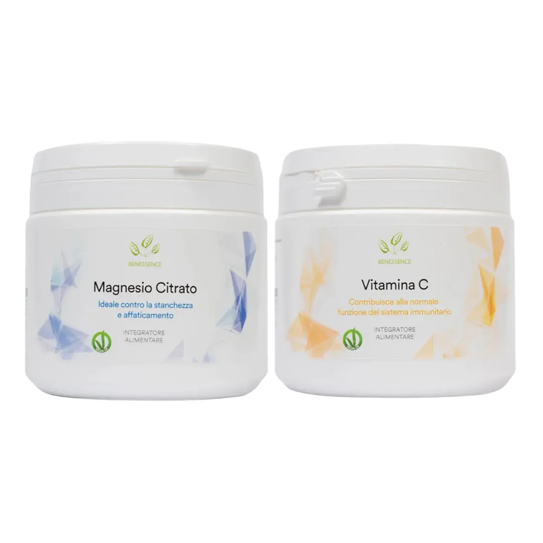 Soluble powdered food supplements of Vitamin C and Magnesium Citrate. Vitamin C is useful for 500 days of integration and Magnesium Citrate for 100 days of integration.