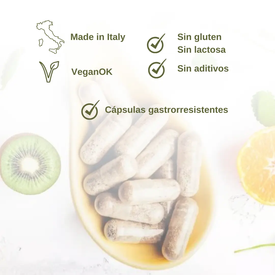 • Cápsulas gastrorresistentes: Para que los probióticos y prebióticos puedan atravesar el pH ácido del estómago, hemos optado por utilizar cápsulas vegetales. Por lo tanto, son capaces de resistir los jugos gástricos. De este modo, el contenido del interior de la cápsula sólo se libera cuando llega al intestino, cumpliendo plenamente su función.