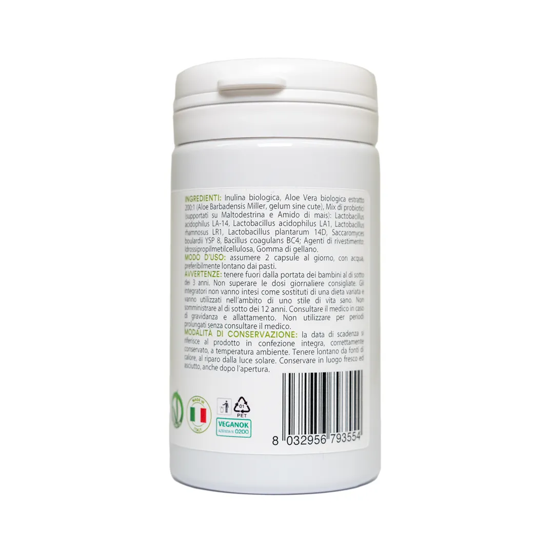 Inci / IngredientesInulina orgánica, extracto de Aloe Vera 200:1 ( Aloe Barbadensis miller , gelum sine cute), mezcla probiótica ( apoyada en maltodextrina), Lactobacillus Acidophilus LA-14, Lactobacillus Acidophilus LA1, Lactobacillus Rhamnosus LR1, Lactobacillus Plantarum 14D, Saccaromyces boulardi YSP 8, Bacillus coagulans BC4; Agentes de recubrimiento: Hidroxipropilmetilcelulosa, Goma Gellan.