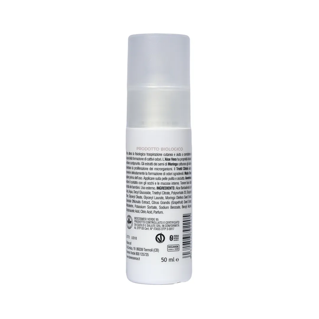 • Antiolor: Ayuda a combatir las causas de la formación de malos olores gracias a la acción del Citrato de Trietilo. Respetando la transpiración cutánea, los extractos de semillas de Moringa, capaces de captar los olores, frenan también la proliferación de microorganismos.