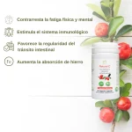 Acerola (Malpighia glabra L. fructus) extracto seco titulado al 50% en Vitamina C 48,4%, Rosa canina (Rosa Canina L. fructus) extracto seco titulado al 70% en Vitamina C 34,4%; Maltodextrina; Agentes de recubrimiento: Hidroxipropilmetilcelulosa, Goma Gellan.