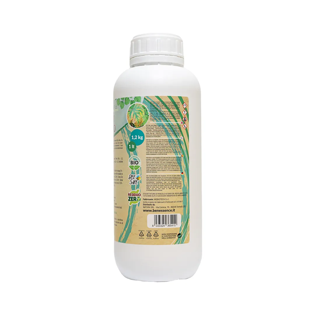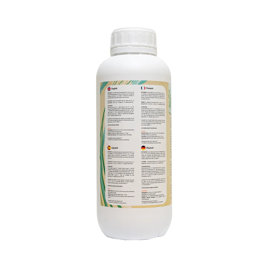 NUTRI MICRO BIO es una formulación a base de micronutrientes (B, Fe, Mn, Zn, Cu, So) complejados con ácido lignosulfónico, ideal para curar rápidamente o evitar todas las carencias de micronutrientes.