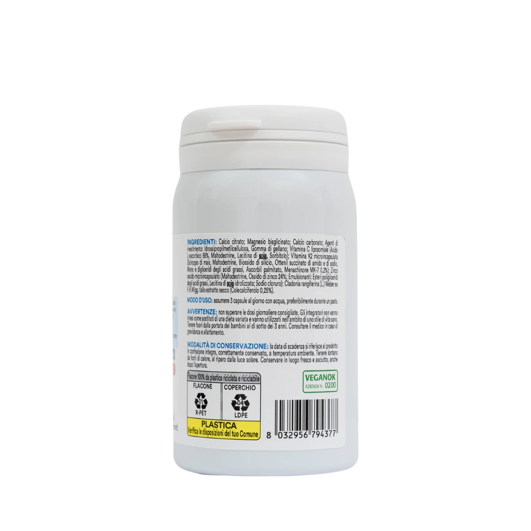 Inci / IngredientesCitrato de calcio; Bisglicinato de magnesio; Carbonato de calcio; Agentes de recubrimiento Hidroxipropilmetilcelulosa, Goma Gellan; Vitamina C liposomal (Ácido L-ascórbico 58%, Maltodextrinas, Lecitina de soja, Sorbitol); Vitamina K2 microencapsulada (jarabe de maíz, maltodextrinas, dióxido de silicio, octenil succinato sódico de almidón, mono y diglicéridos de ácidos grasos, palmitato de ascorbilo, Menaquinona MK-7 0,2%); Óxido de zinc microencapsulado (maltodextrinas, óxido de zinc 24%; emulgentes: Ésteres poliglicéridos de ácidos grasos, lecitina de soja hidrolizada; cloruro sódico); Cladonia rangiferina (L. ) Weber ex F.H.Wigg. extracto seco de talo (colecalciferol 0,25%).