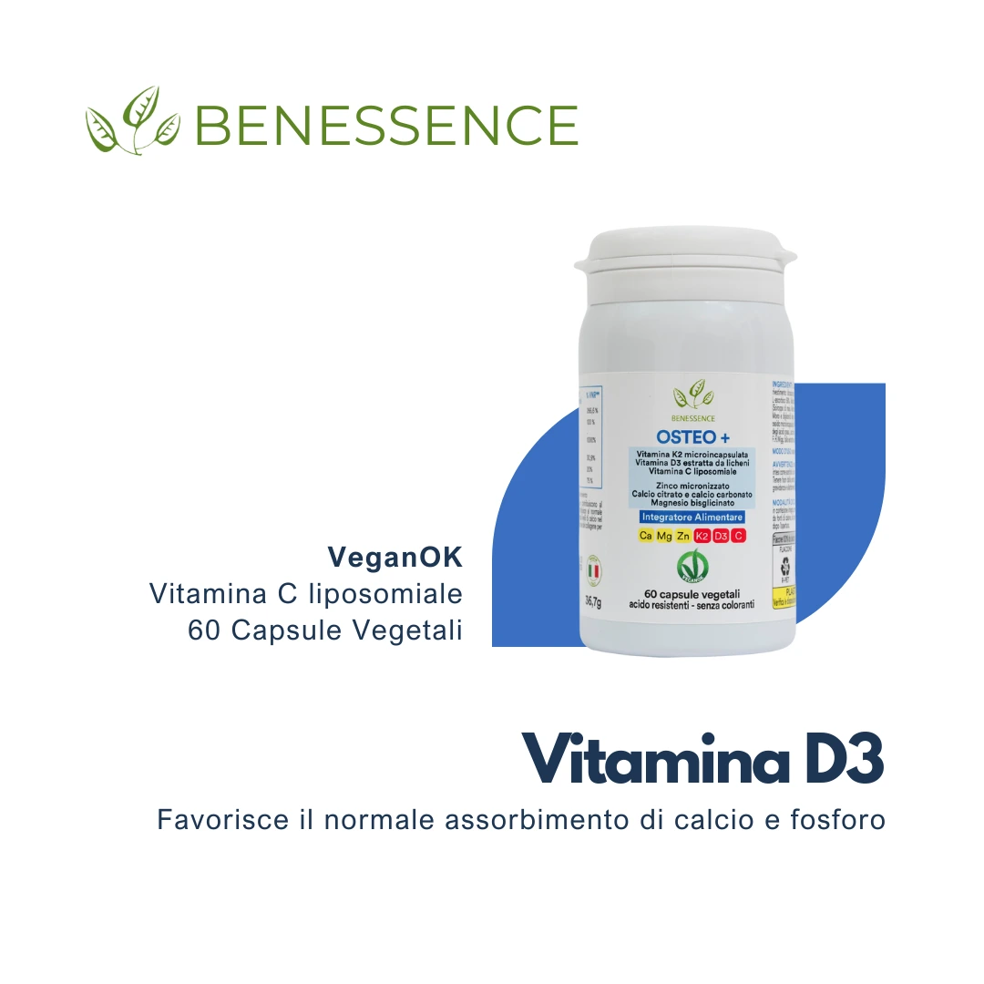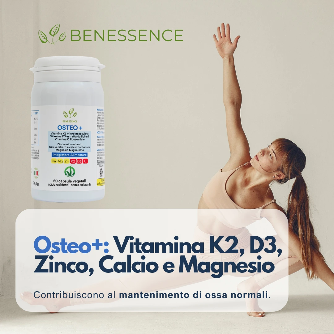 Osteo + es un suplemento de Calcio, Magnesio y Zinc enriquecido con Vitamina K2, Vitamina D3 y Vitamina C. Favorece la salud del sistema óseo, apoyando el buen funcionamiento de los huesos.