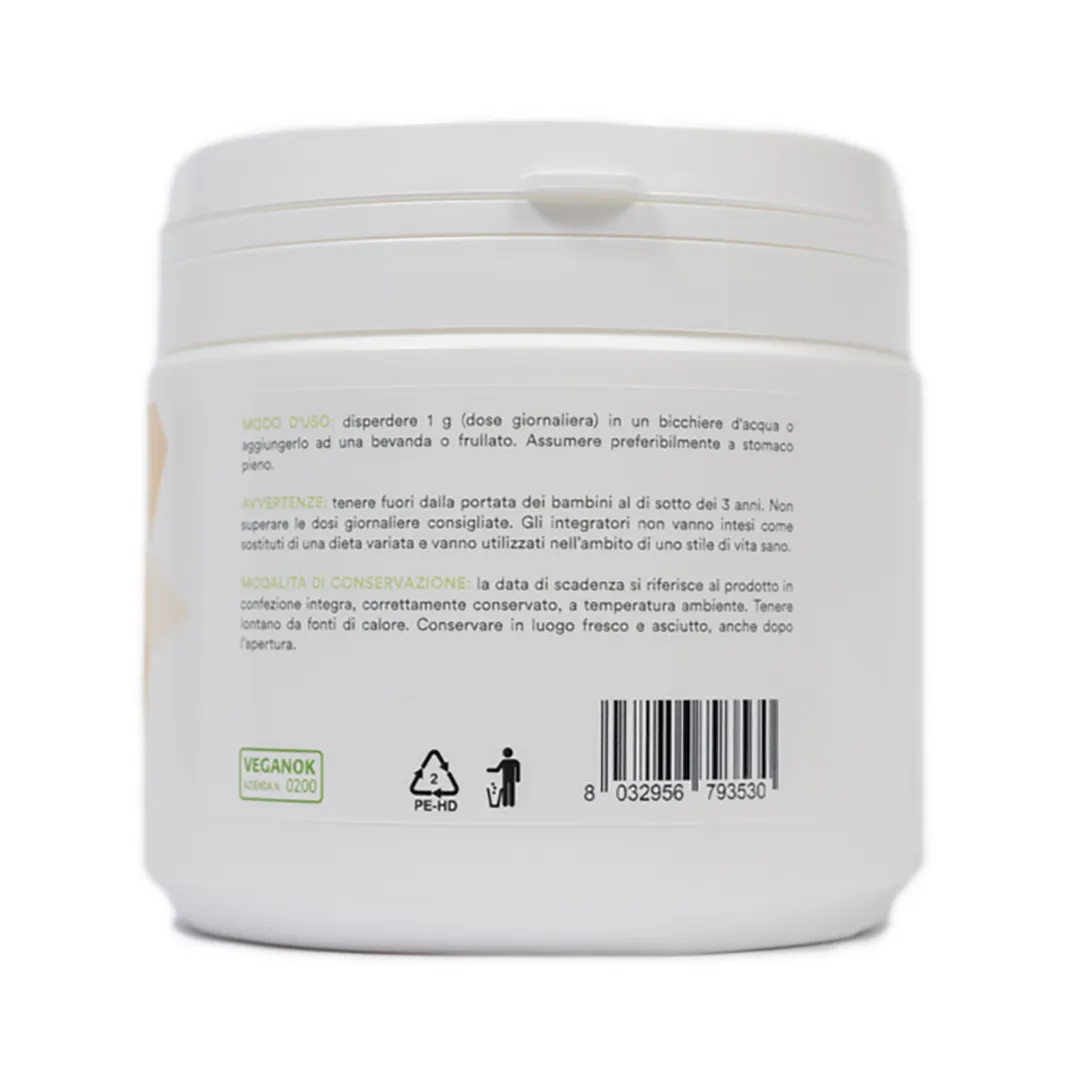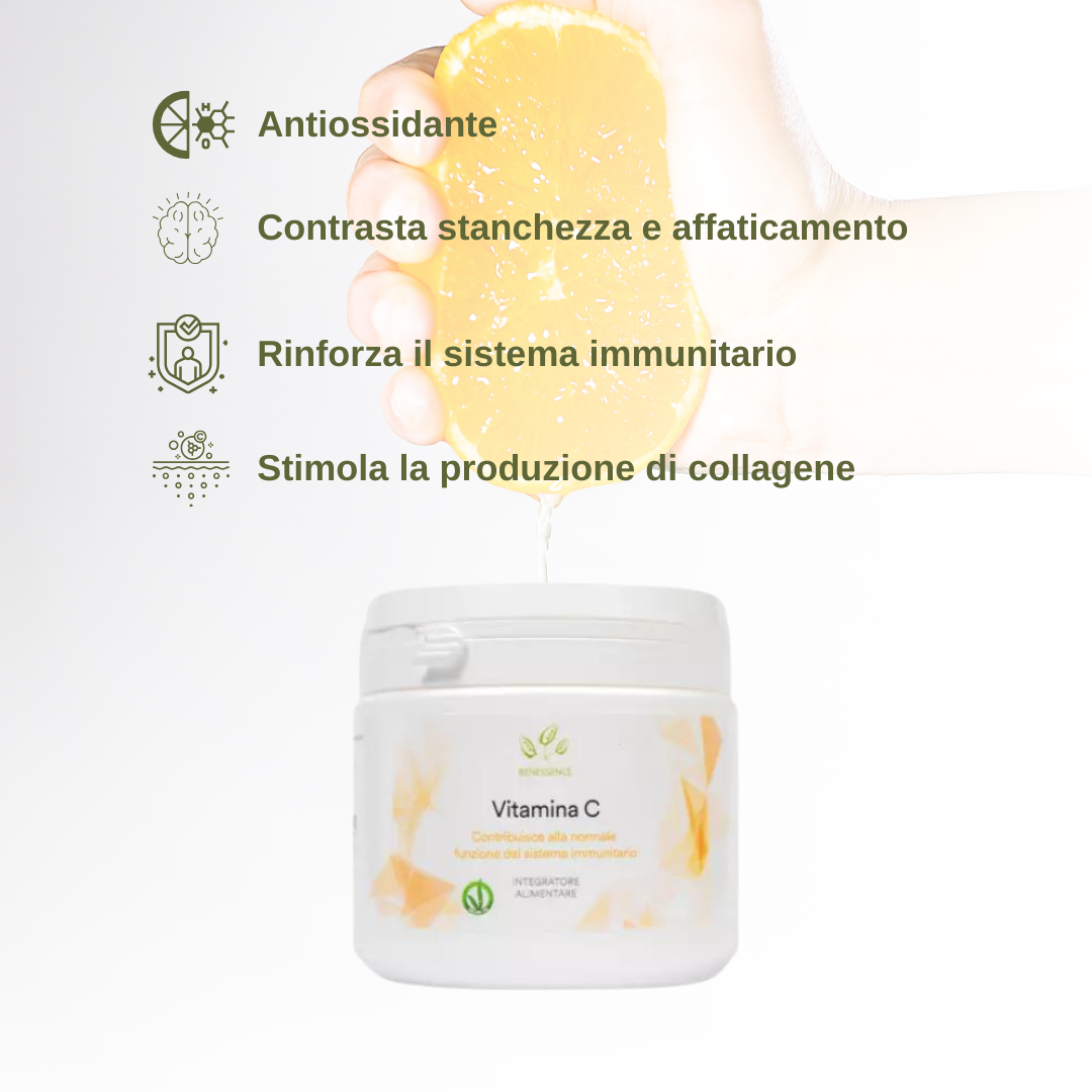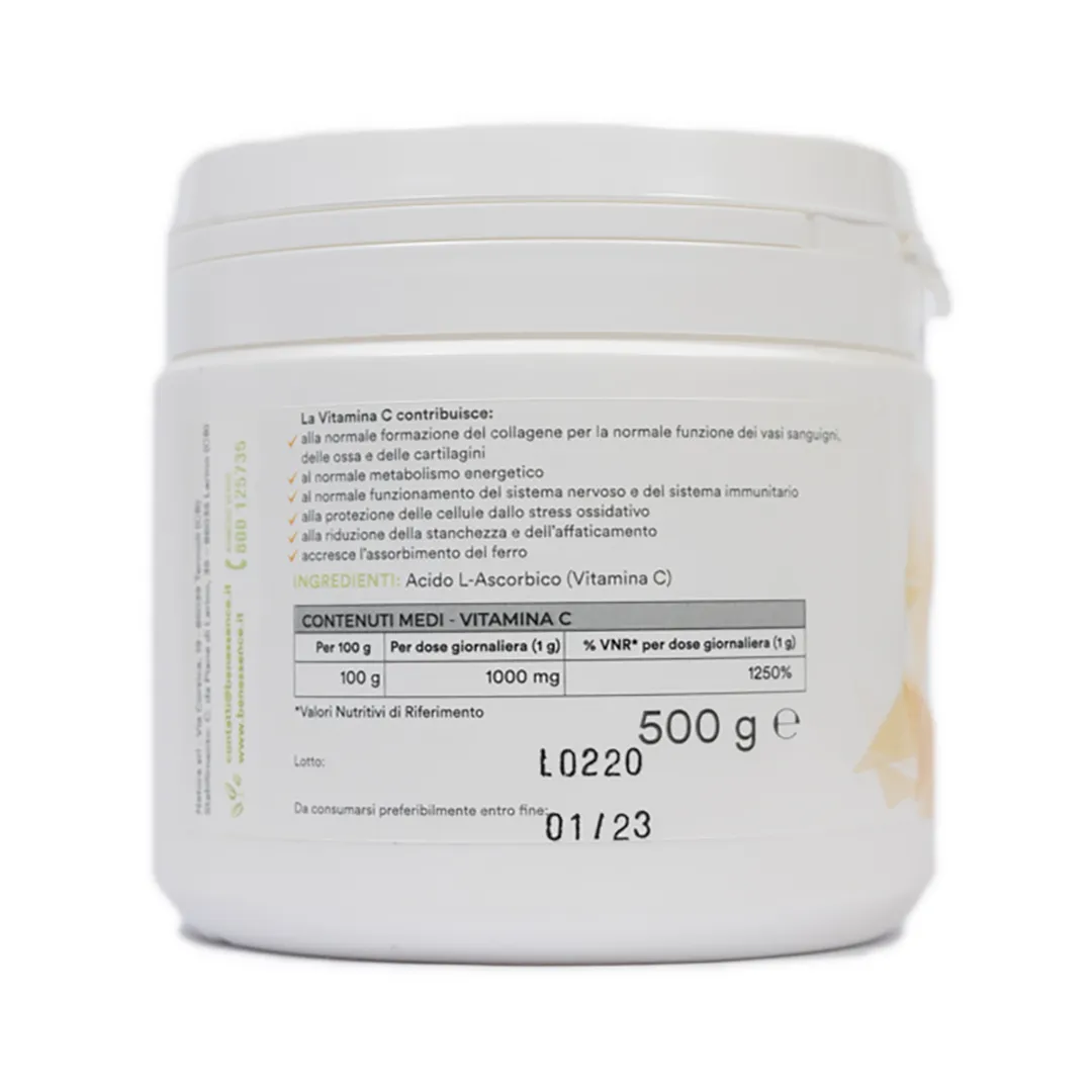 Complemento alimenticio de vitamina C en polvo soluble. Útil para 500 días de suplementación, contiene únicamente ácido L-ascórbico puro. La vitamina C interviene en numerosos mecanismos esenciales para nuestro bienestar, pero nuestro organismo es incapaz de producirla por sí mismo. Por este motivo, debe ingerirse necesariamente para que se absorba y metabolice.