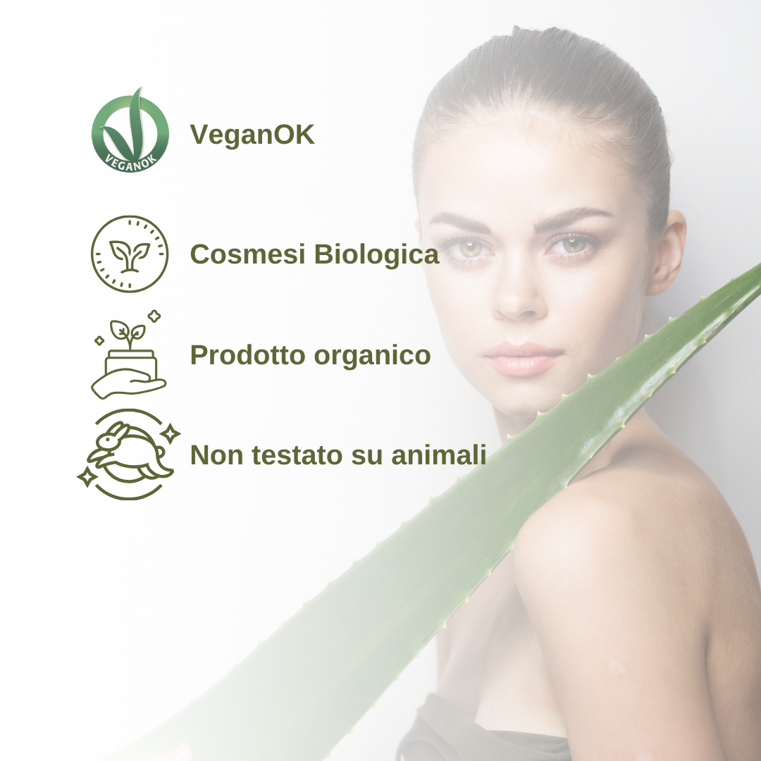 • Zero acqua aggiunta: I nostri prodotti hanno la peculiarità di essere formulati utilizzando il succo di Aloe vera in sostituzione all’acqua, inoltre, sono al 100% Vegan.