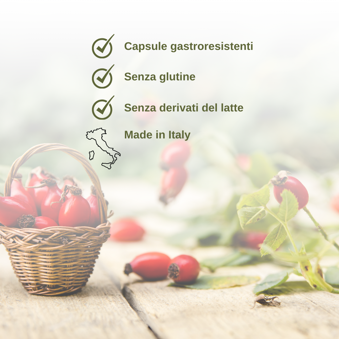 Grazie alla presenza dei bioflavonoidi, composti antiossidanti che si trovano in abbondanza nell’Acerola e nella Rosa Canina, la Vitamina C è protetta dall’ossidazione. Questo processo naturale ne prolunga l’efficacia nel corpo, permettendo un assorbimento più lento e costante, e potenziandone l’azione benefica. Le capsule vegetali gastroresistenti assicurano che gli ingredienti attivi vengano rilasciati direttamente nell’intestino, dove la loro biodisponibilità è massimizzata, garantendo un’assimilazione ottimale senza irritare lo stomaco.