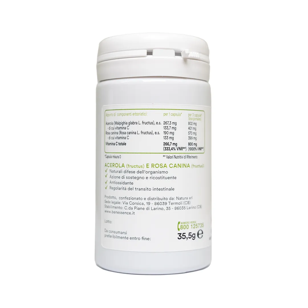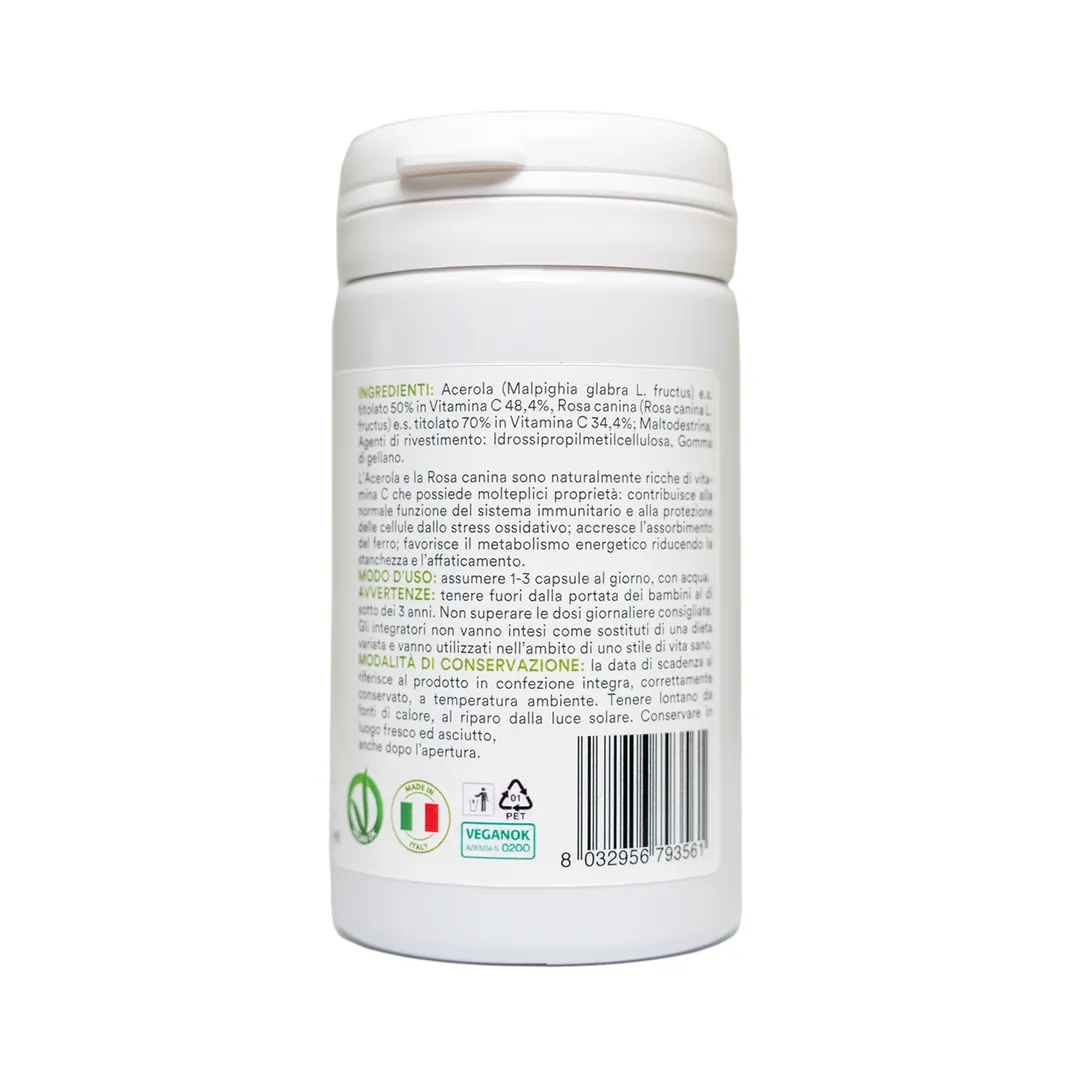 Vitamina C da fonti naturali in capsule vegetali con Acerola e Rosa Canina.