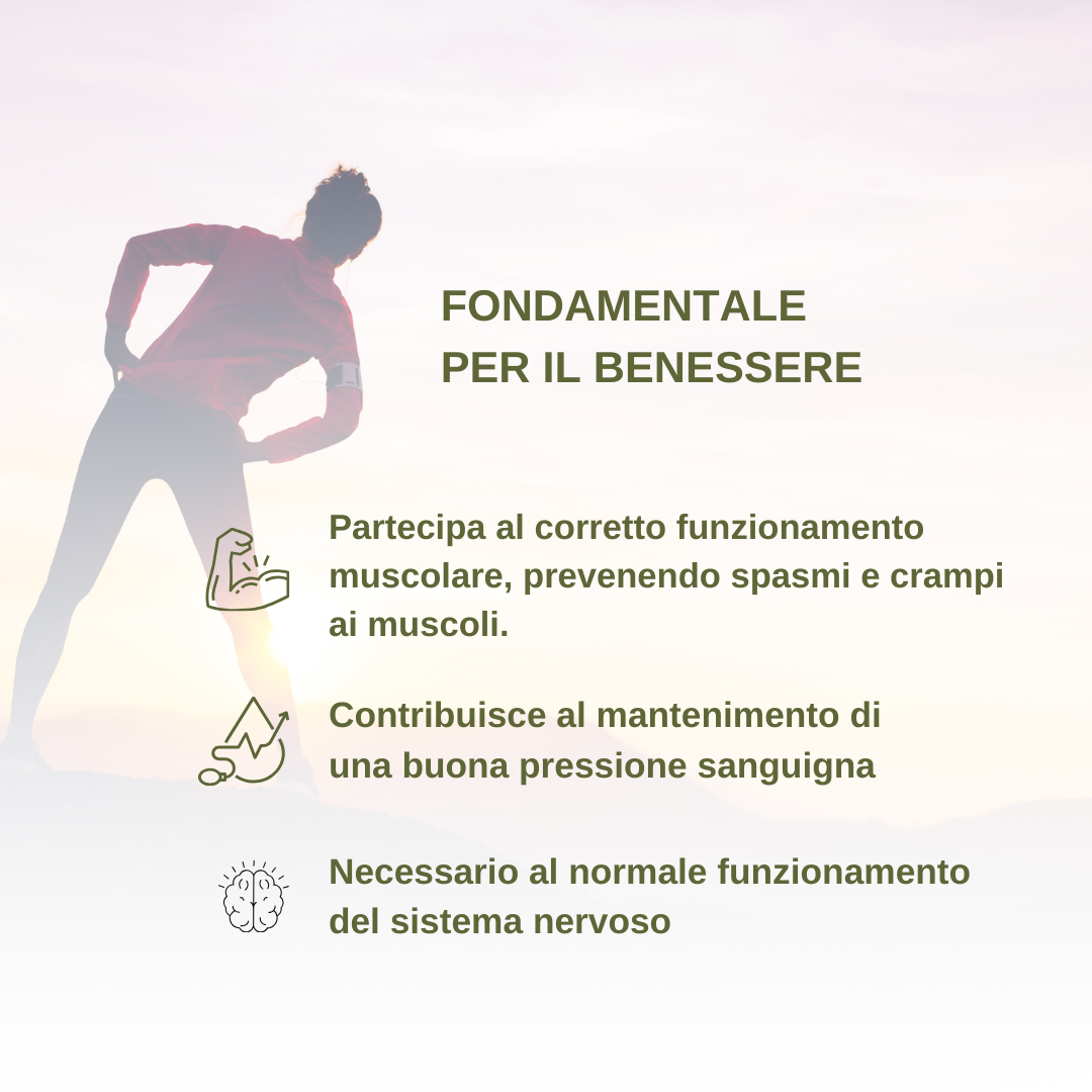 • Sostegno al corretto funzionamento muscolare, prevenendo la comparsa di spasmi, crampi e affaticamento muscolare.