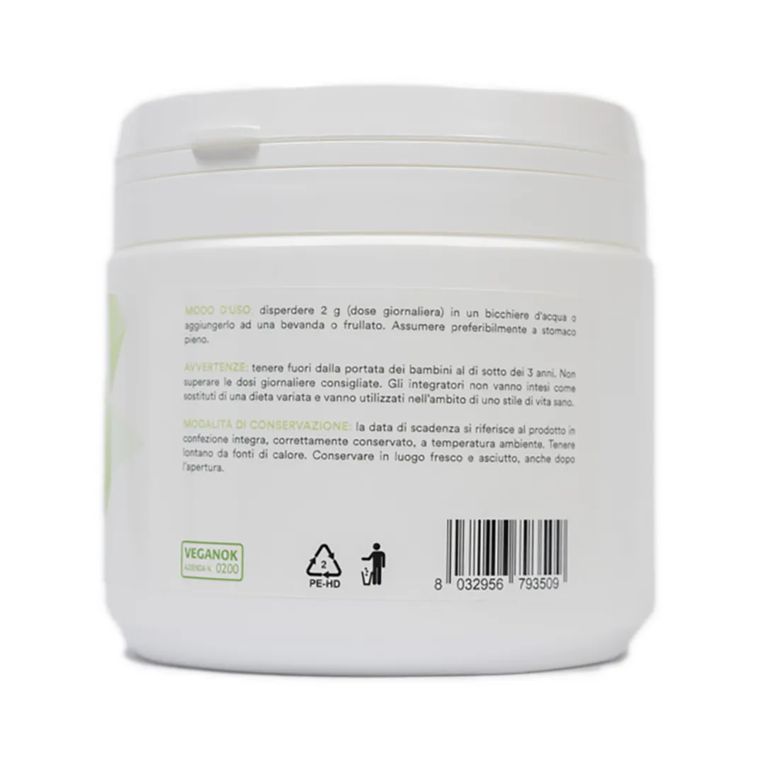 Modalità d’usoDisperdere 2 g/die (corrispondenti alla seconda tacca del misurino dosatore) in un bicchiere d'acqua o aggiungerlo ad una bevanda o frullato. Assumere preferibilmente a stomaco pieno.