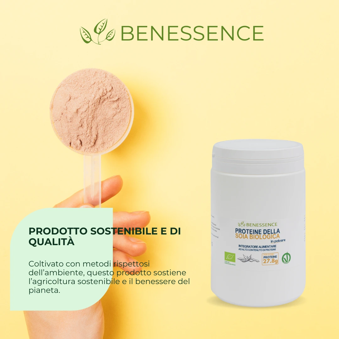 Le proteine fanno parte dei macronutrienti principali e svolgono numerose funzioni fondamentali per il nostro benessere. In particolare, le proteine hanno una importante funzione strutturale, essendo parte degli elementi costitutivi di molti tessuti corporei quali muscoli, pelle, capelli e unghie. Di conseguenza, le proteine vegetali della soia biologica costituiscono una fonte proteica e di aminoacidi essenziali perfetta per supportare la crescita e il mantenimento della massa muscolare e promuovere la salute delle ossa. Numerosi studi hanno dimostrato che le proteine vegetali contribuiscono allo sviluppo della massa muscolare con la stessa efficacia delle proteine del latte, ma sono più sostenibili ed eco-friendly!