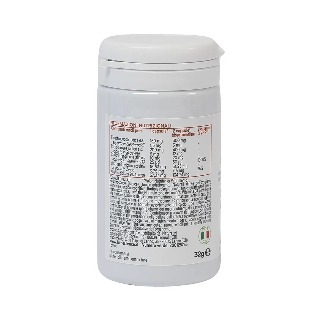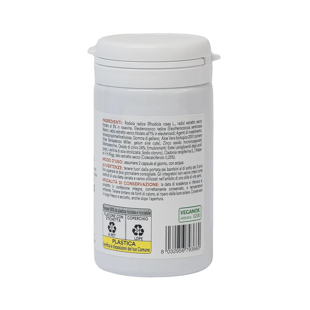 Inci / IngredientiRodiola radice (Rhodiola rosea L., radix) estratto secco titolato al 3% in rosavine, Eleuterococco radice (Eleutherococcus senticosus Maxim, radix) estratto secco titolato all’1% in eleuterosidi; Agenti di rivestimento: Idrossipropilmetilcellulosa, Gomma di gellano; Aloe Vera biologica 200:1 polvere (Aloe Barbadensis Miller, gelum sine cute), Zinco ossido microincapsulato (Maltodestrine, Ossido di zinco 24%; Emulsionanti: Esteri poligliceridi degli acidi grassi, Lecitina di soia idrolizzata; Sodio cloruro), Cladonia rangiferina (L.) Weber ex F.H.Wigg. tallo estratto secco (Colecalciferolo 0,25%).